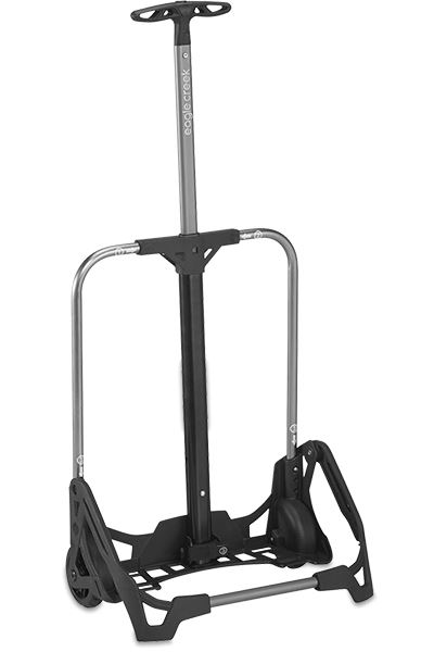 Two compartments, a ticket pocket and front stash pocket make up a bag with tuck-away shoulder straps and a removable aluminium wheeled frame that fits inside the bag when not needed.